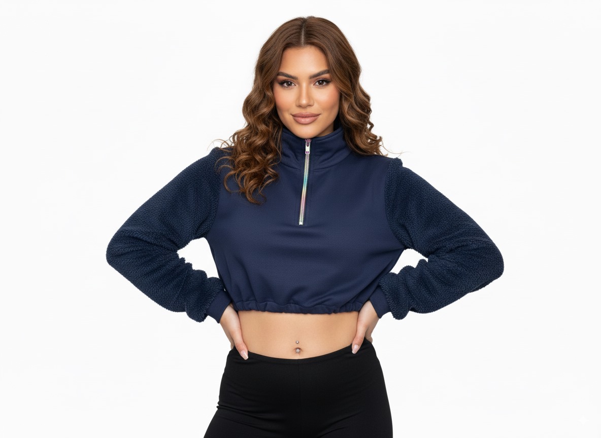 Dale un toque chic a tu look con nuestro buzo tipo cadete crop top: mangas en peluche y cremallera de fantasía. ¡Comodidad y glamour en una sola prenda!