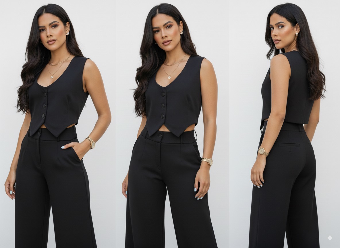 Elegancia versatilidad con nuestro conjunto de tres piezas: pantalón, chaleco y top que combinan lo formal y casual. Perfecto para un estilo moderno y sofisticado.